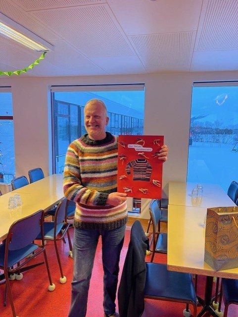 Jón Pétur fyrir þremur árum þegar hann fékk peysu að gjöf frá starfsmönnum skólans af tilefni 25 skiptið sem danskennari við skólann