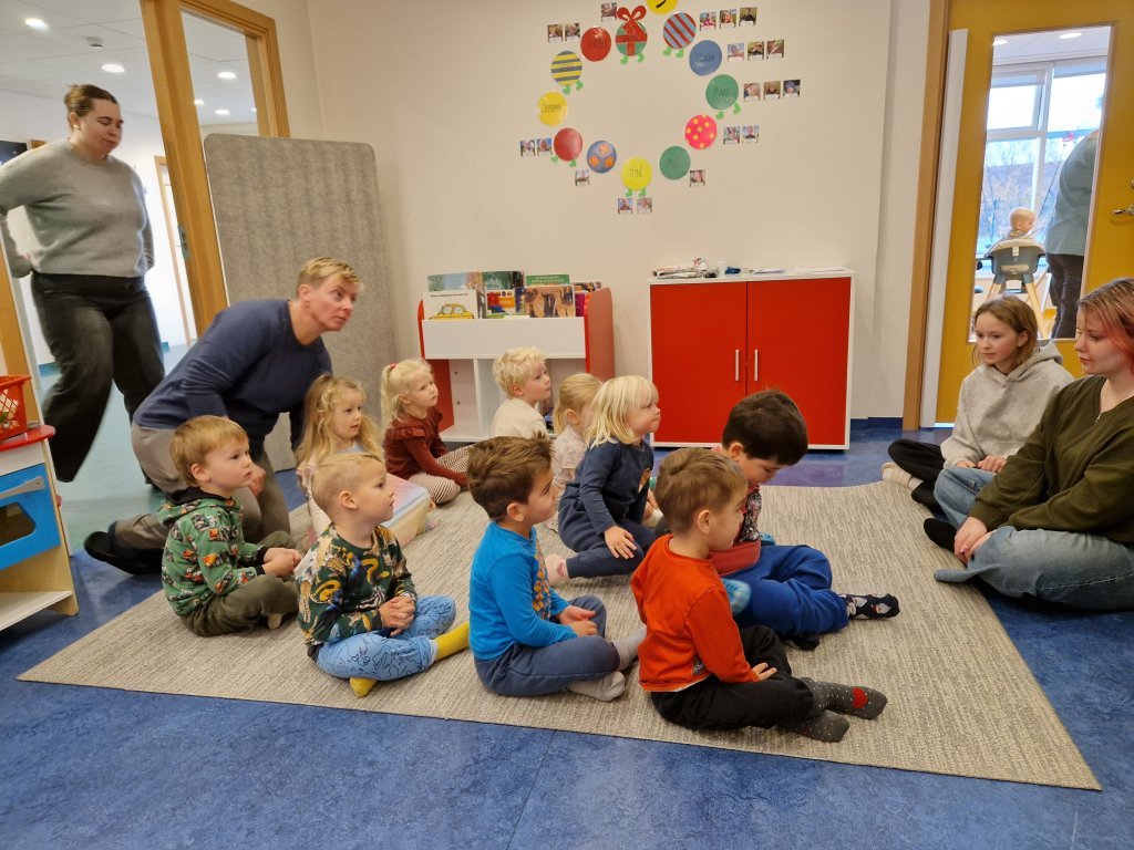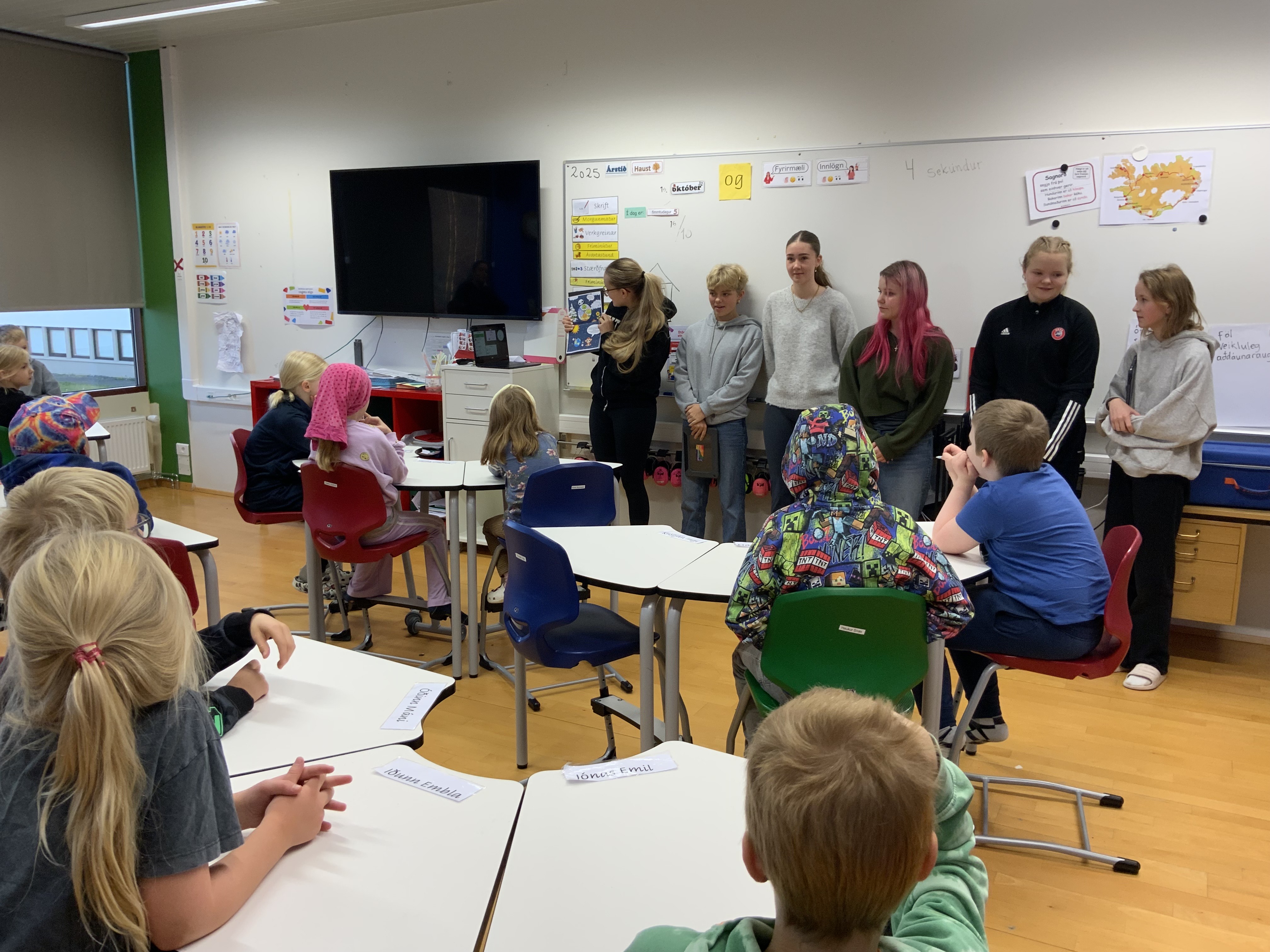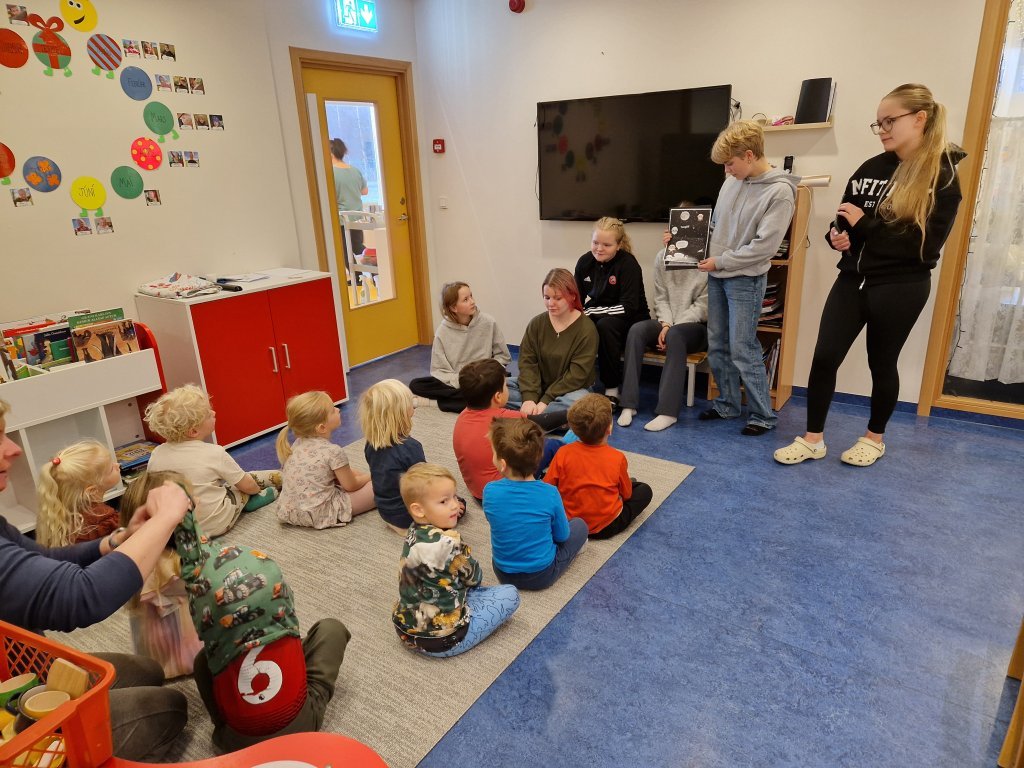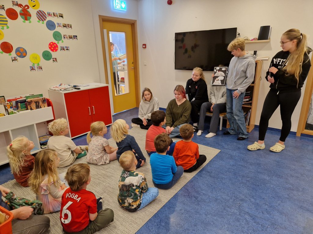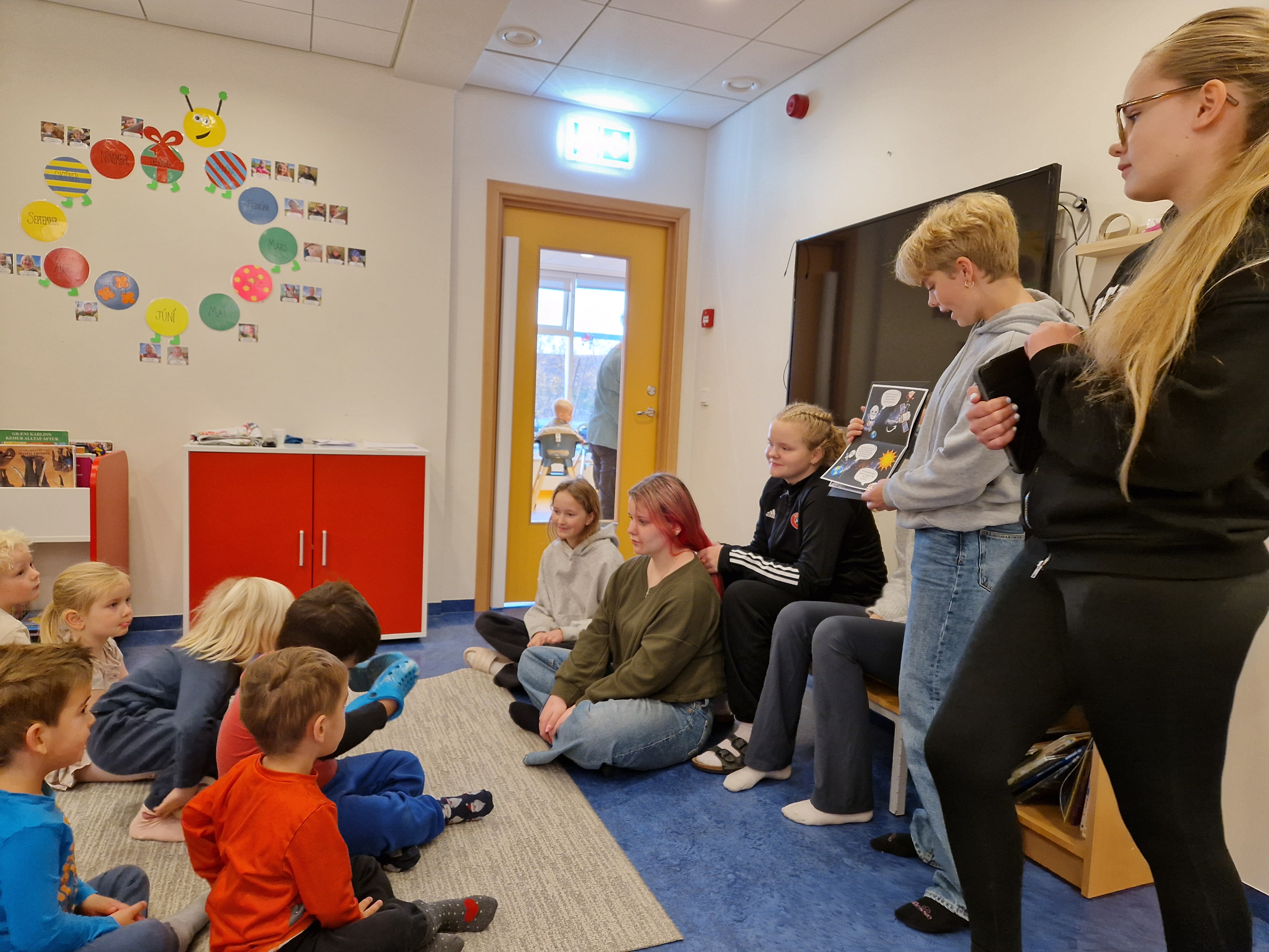 Í dag fengu Barnaborg og yngsta stig grunnskólans góða heimsókn frá unglingastigi. Hópur nemenda kom og las barnabók sem þau sömdu. Það er alltaf spennandi fyrir leikskólabörnin þegar unglingarnir koma í heimsókn og þau hlustuðu af áhuga og athygli. Nýja barnabókin er verkefni í náttúrufræði upp úr bókinni Sól, tungl og stjörnur. Fyrst var unglingunum skipt í hópa þar sem hver hópur fékk einn kafla til að einfalda. Markhópurinn var eldri hópur í leikskóla og yngsta stig. Þegar því var lokið var þeim aftur skipt í hópa þar sem þau skiptu með sér verkum eins og að gera auglýsingar og kynningar, bókarkápuna, teikningar og uppsetning. Úr varð falleg, auðskiljanleg bók með grípandi myndskreytingu. Í þessu verkefni fólst markmið um að auka þekkingu unglinga og yngri barnanna í náttúrufræði. Auk þess er verkefnið er liður í því að auka áhuga á bókum og lestri og stuðla að samheldni og skapandi skólastarfi.